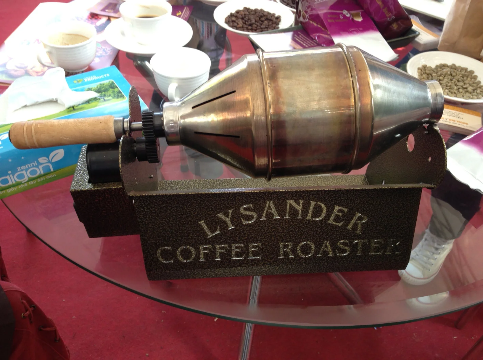 He also showed us the sample roaster he's been using for a number of years, a Lysander. I was not aware of this machine's existence. Not only was it pleasing to see, but the price range was just right (about $200). I'd love to have one. If there are any Angel Investors reading this, I'll take some seed money now, and this will be my first purchase: