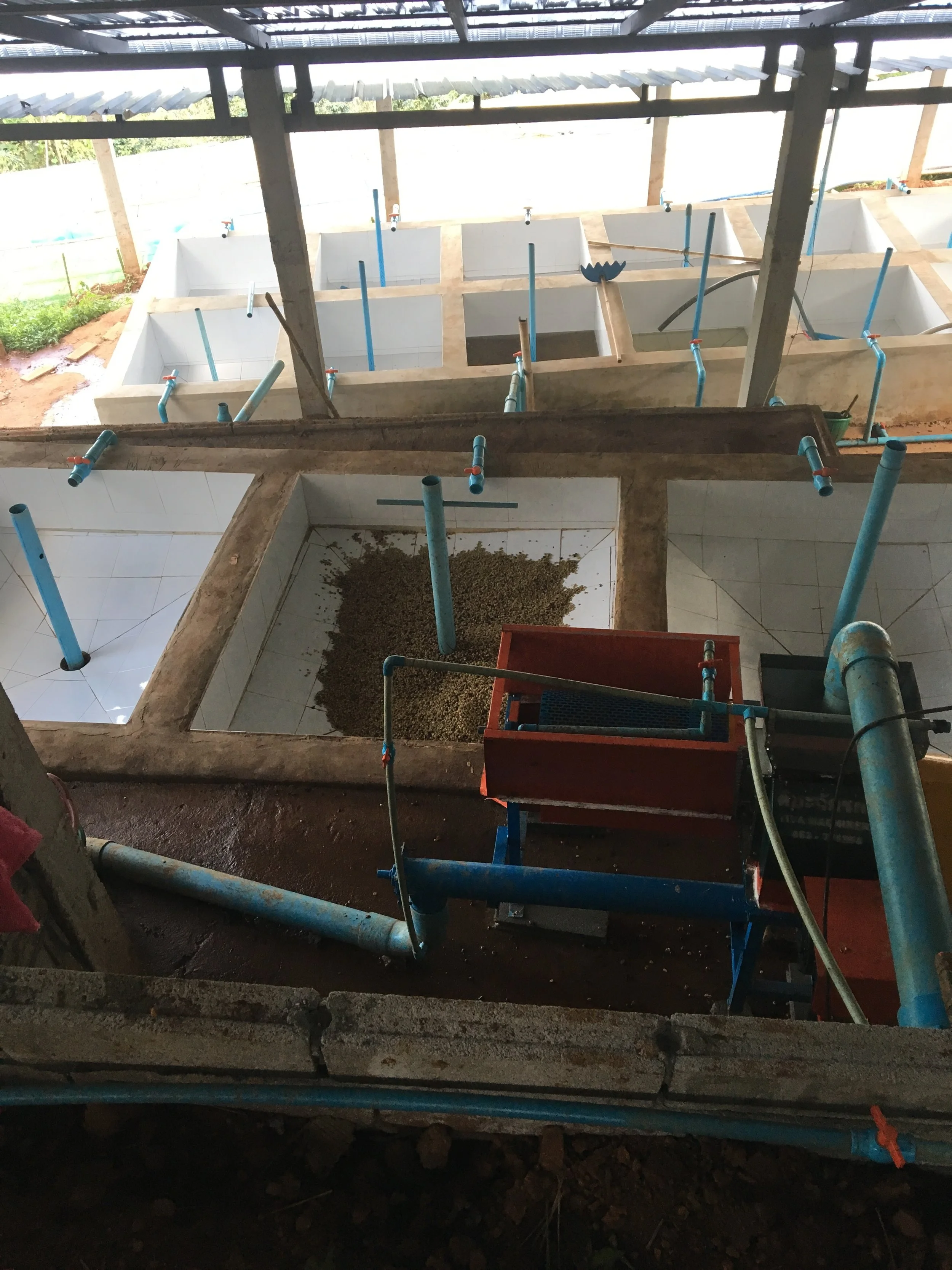 Their mill is impressive, with plenty of capacity for modest production of clean, well-processed coffee. A clever build on a hillside allowed them to feed the mill with water from a spring just a bit higher on the slope. A cherry receiving tank sat atop the mill, where floaters are removed and cherry quality observed prior to being released into the pulper, then into one of several tile-lined fermentation tanks. Further sorting can be done here, as can separations based on current needs. These tanks then drain into several more tanks downhill, where they can relieve the volume demands from the primary tanks. Secondary soaking or washing can occur in these lower tanks as well, and they then lead to collection areas for transfer to raised drying beds. The pipes are all interchangeable, which allows for transfer from any one upper tank to the ones below. This modular setup keeps them nimble and allows for experimentation of various types. When we visited, they were doing a couple of lots of “Kenya-style double wash and soak” and some honey processed lots.