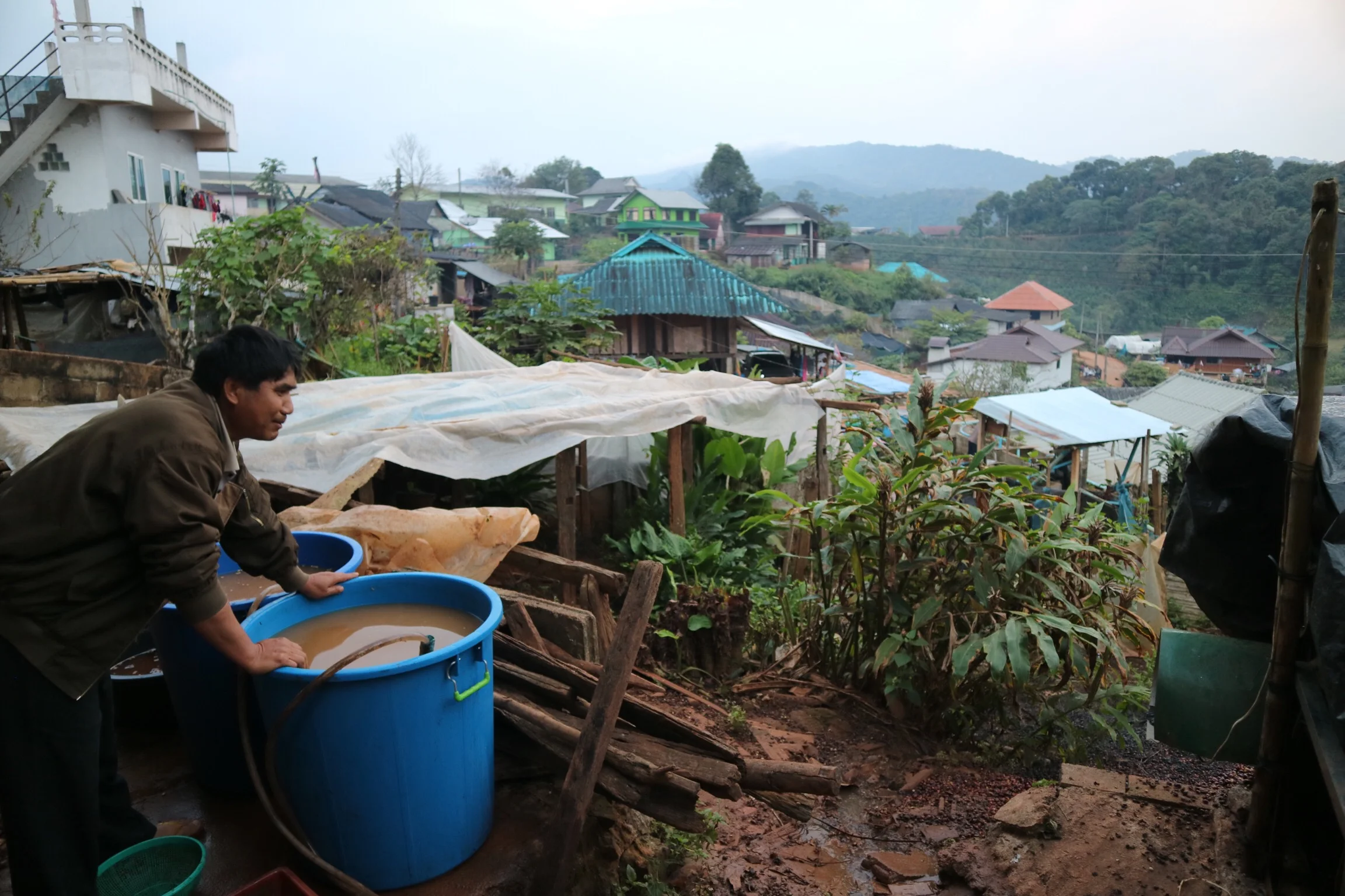 After landing at the mountaintop village, we dropped our luggage and headed straight up to the Doi Pangkhon Wet Mill, owned and operated by five local brothers from the Akha hill tribe. The tribe inhabits the higher elevation mountains spanning a large region - southwest China, eastern Myanmar, western Laos, northwestern Vietnam and northern Thailand. They are known not only for their cultural assets - the intricate embroidery and metal work of their elaborately adorned traditional clothing, their deliciously balanced food - but also for their reverence and stewardship of the mountainous forest environments. They are the only people permitted to cultivate these national preserves, Pangkhon mountains being one of many in the area. Two of the brothers, Apae and Asor, were gracious hosts (though a bit camera-shy), showing us around their wet mill and driving us to a few farms in the area.